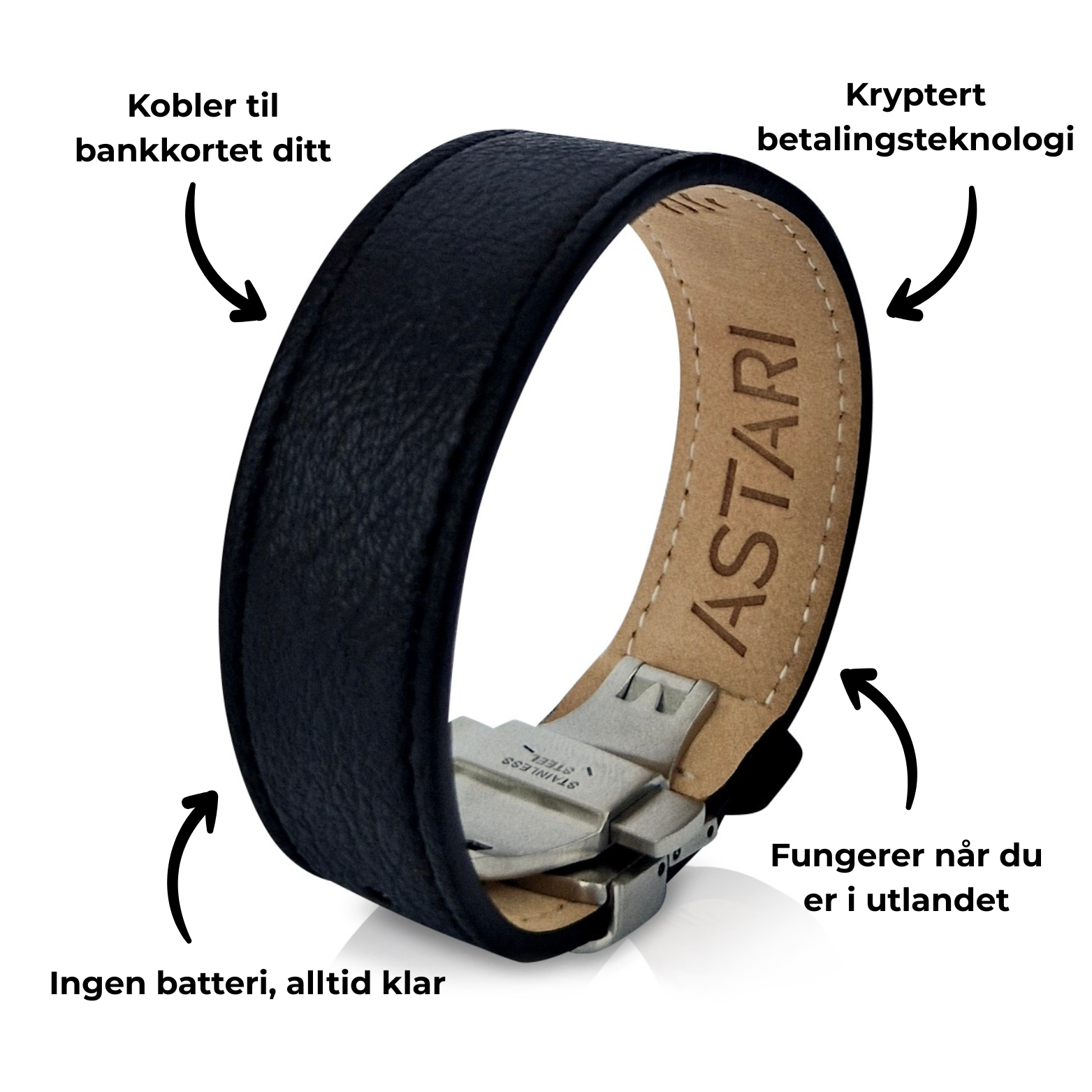 Dette gjør Astari-bærbare enheter til en trygg, pålitelig og privat måte å betale på – uten å trenge telefonen, lommeboken eller laderen din.