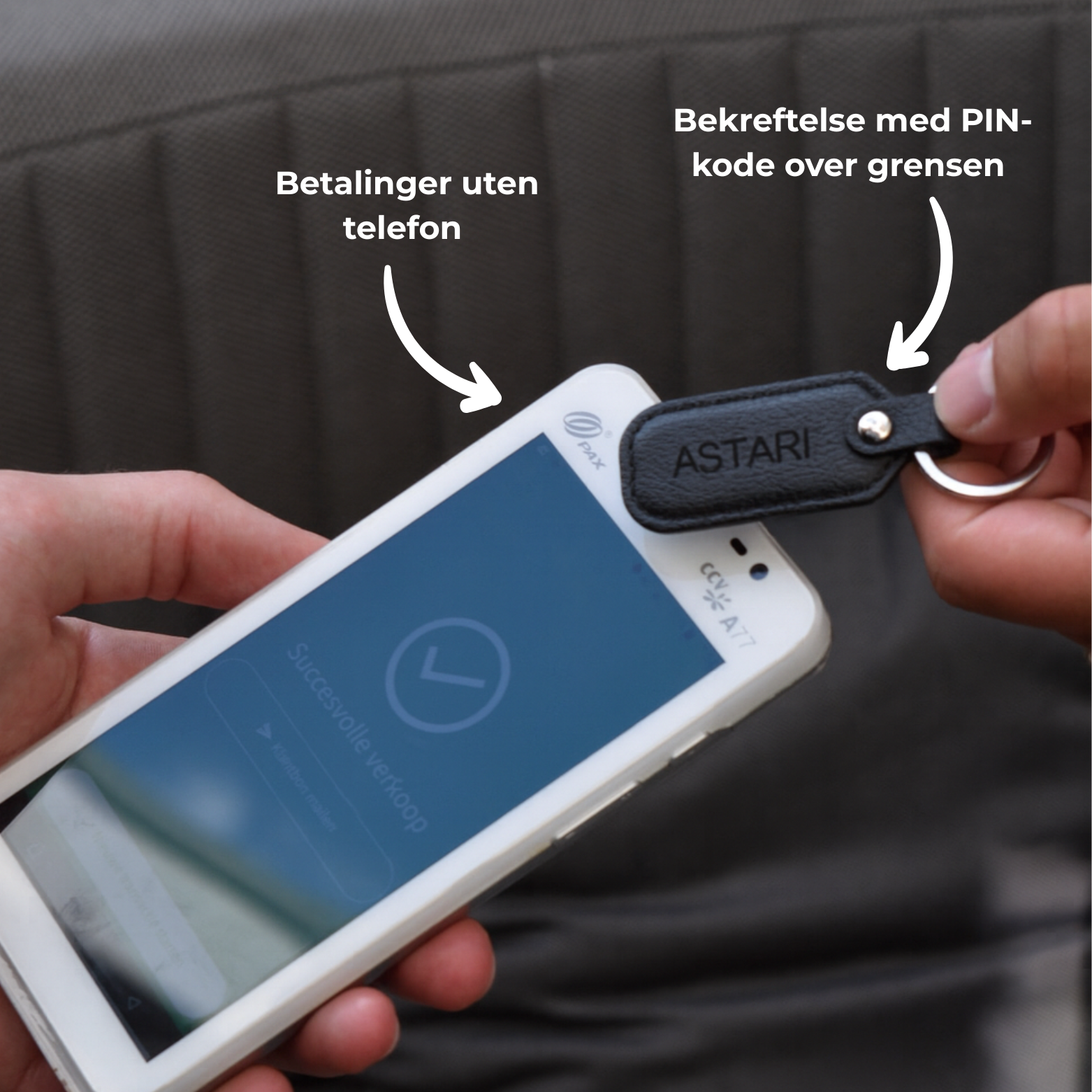 Det er like enkelt å betale som å bruke et kontaktløst kort. Hold Astari-enheten din nær den NFC-aktiverte betalingsterminalen til du hører et pip eller ser en bekreftelsesmelding. Betalingen trekkes automatisk fra det tilknyttede kortet eller kontoen.