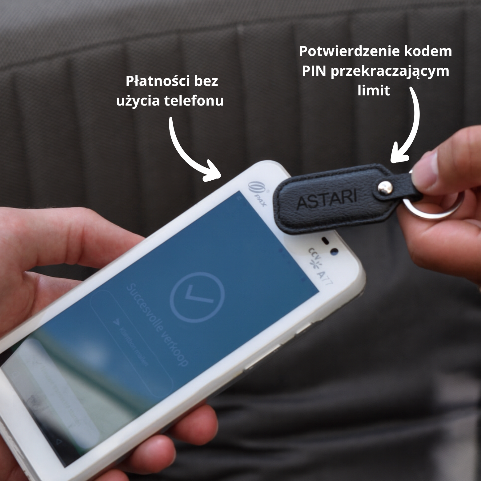 Dokonywanie płatności jest tak proste, jak korzystanie z karty zbliżeniowej. Przytrzymaj swoje urządzenie noszone Astari blisko terminala płatniczego obsługującego NFC, aż usłyszysz sygnał dźwiękowy lub zobaczysz komunikat potwierdzający. Płatność zostanie automatycznie pobrana z przypisanej karty lub konta.