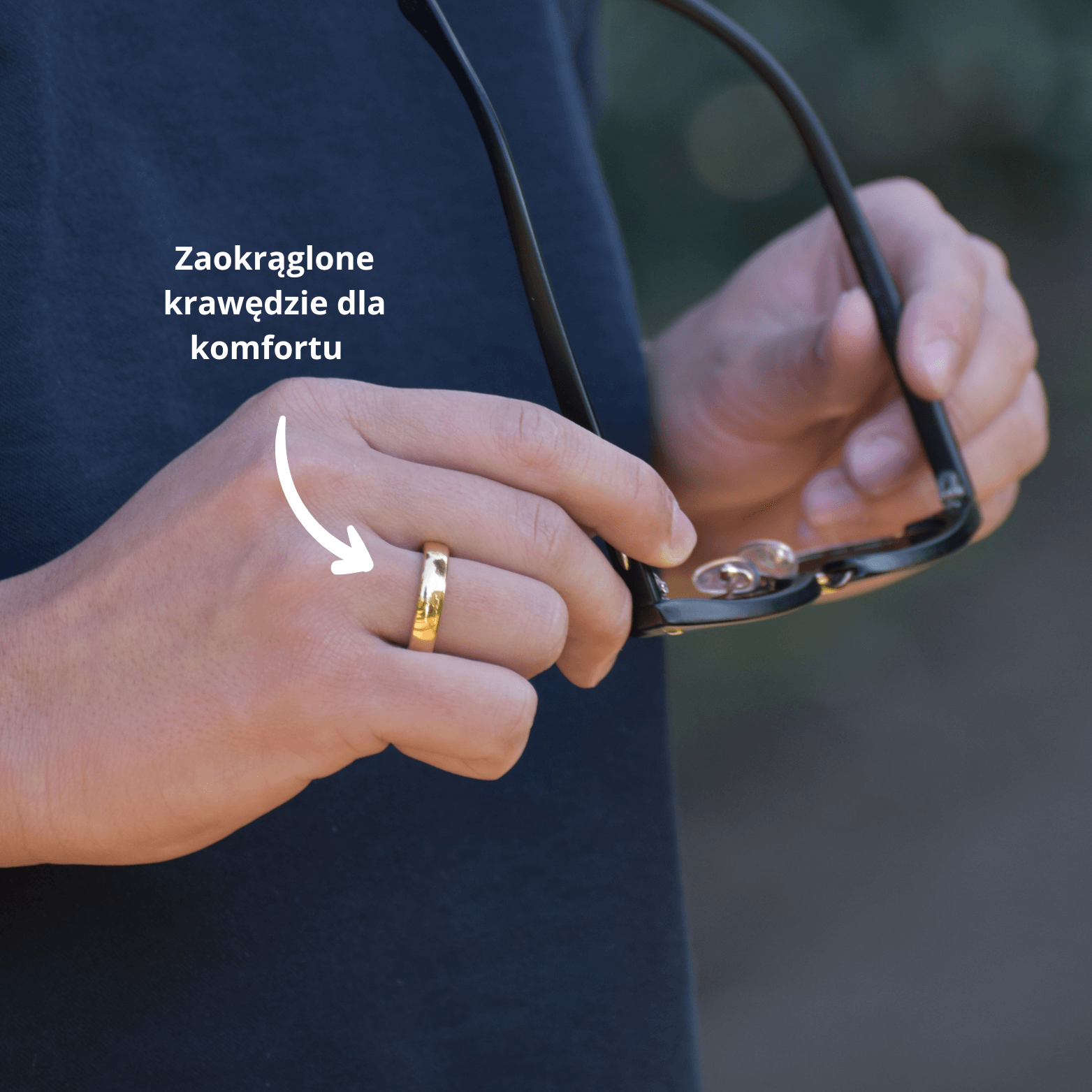Osoba używająca złotego pierścionka płatniczego do płatności bezdotykowej za pomocą czytnika w otoczeniu przyrody.